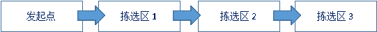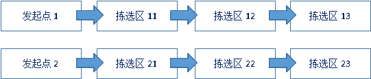 而對(duì)串行揀選來(lái)說(shuō),揀選是從一個(gè)統(tǒng)一的點(diǎn)發(fā)起的,依次完成所有揀選任務(wù)。示意圖如下: