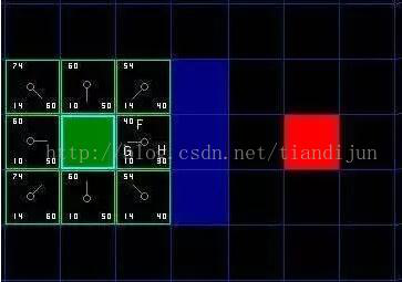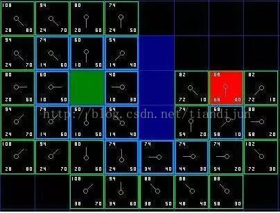 (1)將A點(diǎn)加入到Open List中,圖中所示,上下左右移動(dòng)一格距離為10,斜對(duì)角移動(dòng)距離為14。環(huán)繞綠色方塊的就是待檢測(cè)格子,左下角的值就是G值,右下角為H值,左上角對(duì)應(yīng)的就是F值,找到F值最小的節(jié)點(diǎn)作為新的起始位置。