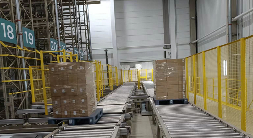 采用輸送機(jī)布局,是大多數(shù)立體庫的首選。這一技術(shù)具有集放能力強(qiáng)、效率高、故障率低、安全可靠等特點(diǎn)。但對(duì)于巷道數(shù)很多的情況,輸送機(jī)有一個(gè)限制是輸送能力問題,一般情況下,對(duì)于150托盤/小時(shí)以內(nèi)流量來說,輸送機(jī)是一個(gè)比較合適的選擇。但更大的流量則要考慮分區(qū)作業(yè),或采用其它方法。輸送機(jī)方案的另一個(gè)缺點(diǎn)是剛性太大,不易擴(kuò)展。