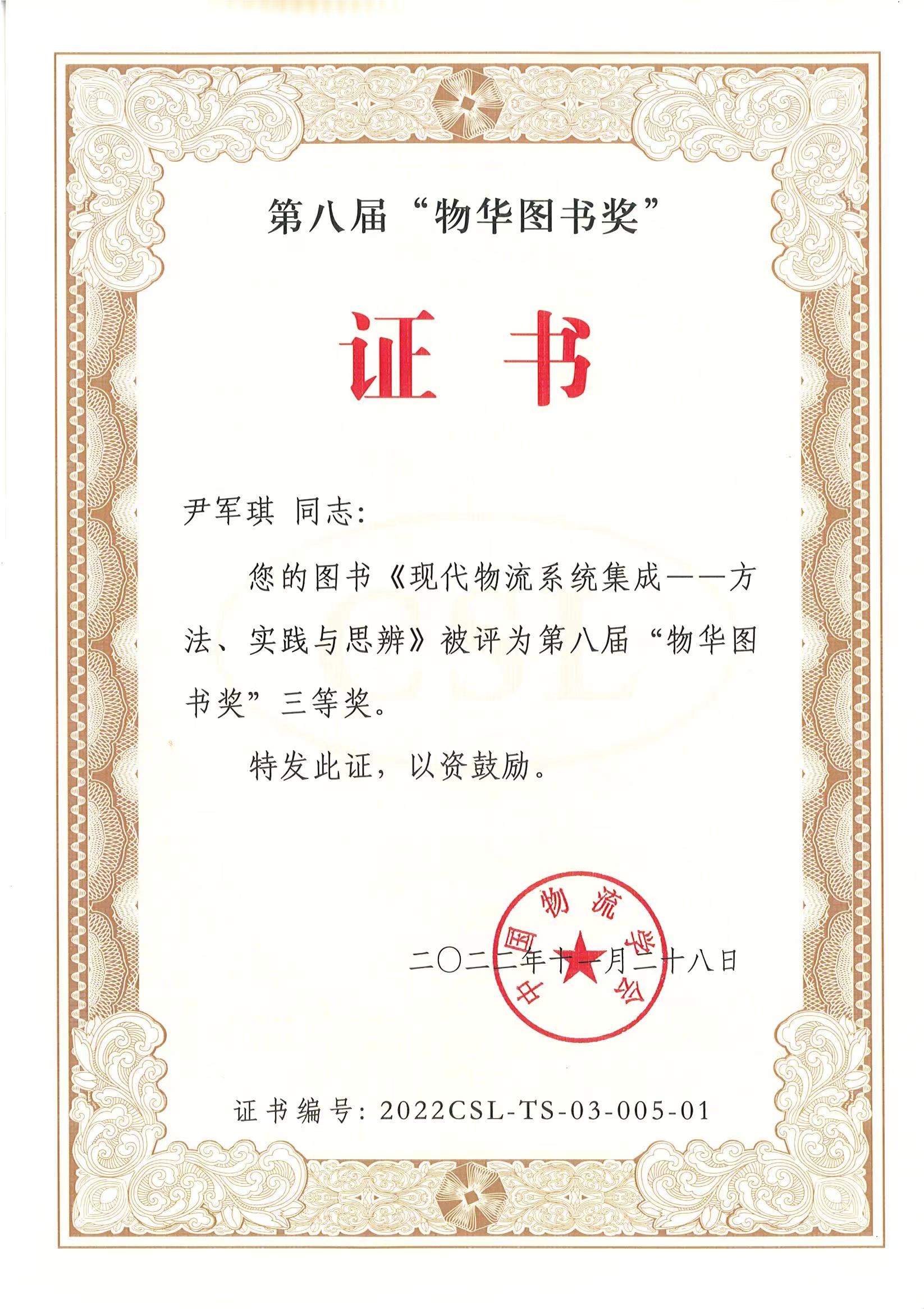 最近,全國第八屆“物華圖書獎”揭曉,伍強智能董事長尹軍琪專著《現(xiàn)代物流系統(tǒng)集成-方法、實踐與思辨》一書榮獲三等獎。