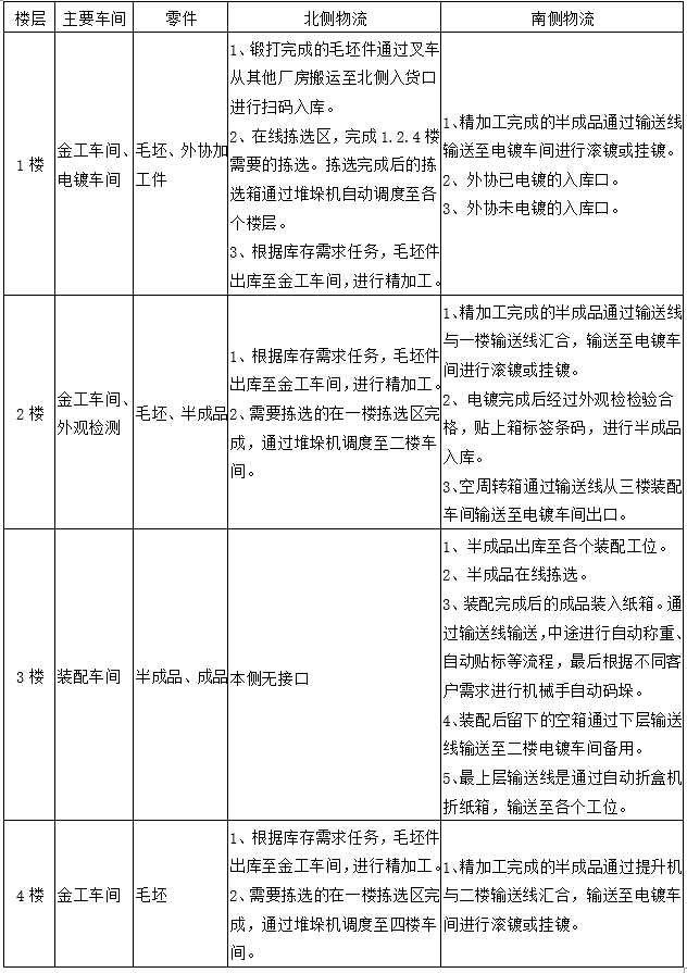物流中心一層:毛坯入庫、毛坯出庫(含整箱出庫和拆零揀選出庫)、外協(xié)加工入庫,外設加工出庫,電鍍;