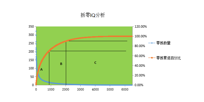 3)IQ分析:每個單品的訂貨數(shù)量分析。這種分析主要用于庫存ABC分析。庫存ABC對于倉庫庫存結構設計和揀選系統(tǒng)的設計都有非常重要的作用。