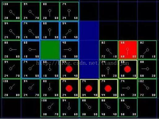 (1)將A點(diǎn)加入到Open List中,圖中所示,上下左右移動(dòng)一格距離為10,斜對(duì)角移動(dòng)距離為14。環(huán)繞綠色方塊的就是待檢測(cè)格子,左下角的值就是G值,右下角為H值,左上角對(duì)應(yīng)的就是F值,找到F值最小的節(jié)點(diǎn)作為新的起始位置。