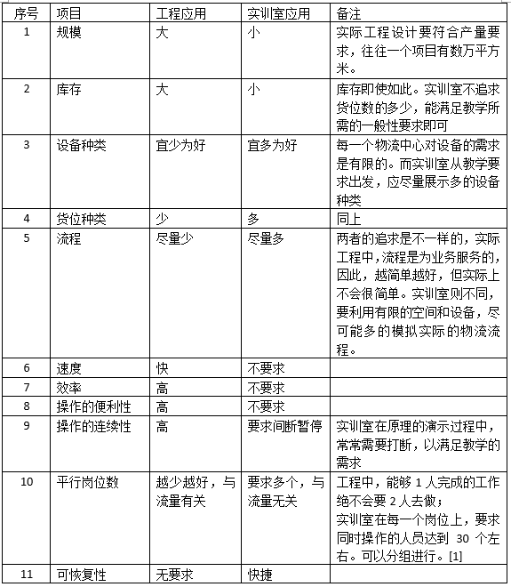 此外,要理解實(shí)訓(xùn)室與企業(yè)具體應(yīng)用存在一個(gè)顯著的差別是:對(duì)一個(gè)實(shí)際應(yīng)用案例來(lái)說(shuō),流程越簡(jiǎn)單越好,速度越快越好,效率越高越好。而實(shí)訓(xùn)室建設(shè),并不追求規(guī)模、速度與效率,而是要在簡(jiǎn)單的實(shí)訓(xùn)室中,要在一個(gè)相對(duì)比較簡(jiǎn)單的環(huán)境中,模擬出現(xiàn)實(shí)中復(fù)雜的物流過(guò)程和應(yīng)用。表一列出了一些主要差異。
