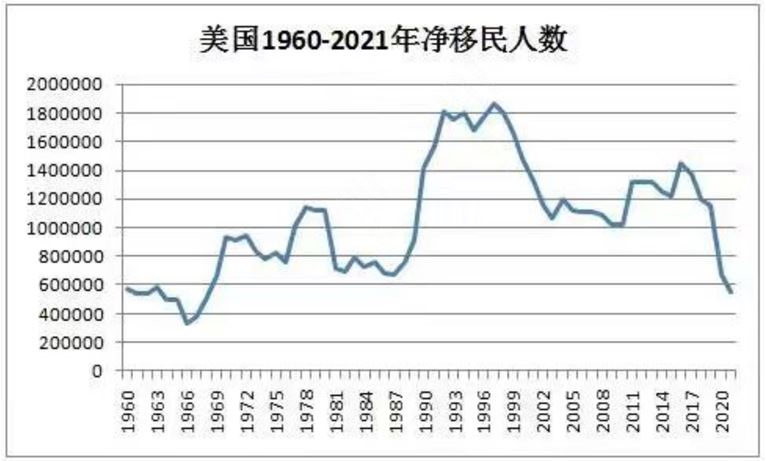 美國最近幾年的民人口減少,疫情可能是一個原因,另一個原因可能與中國的貿(mào)易戰(zhàn),以及美國改變移民政策有關(guān)。未來預(yù)測,其每年的移民平均值仍然將達(dá)到100萬左右。